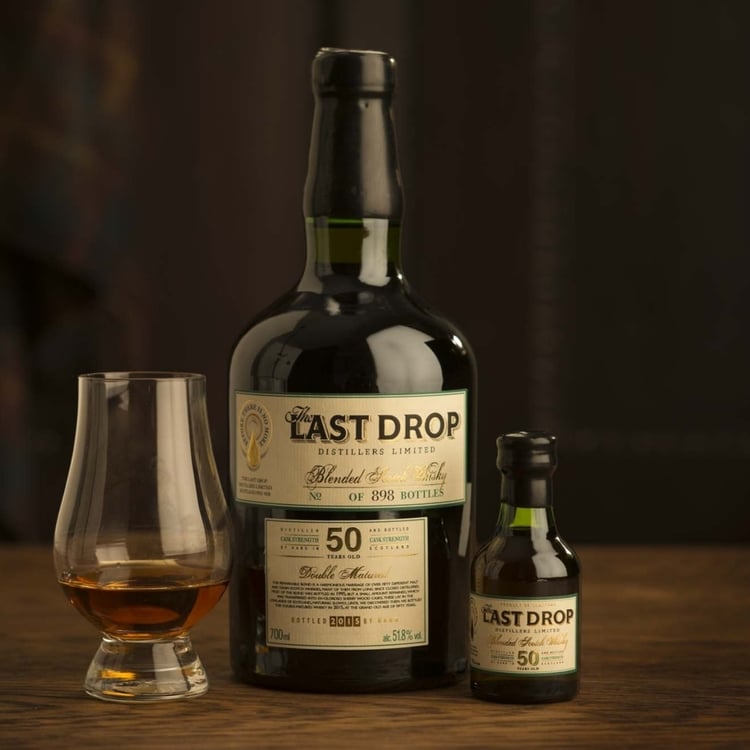 We now bring you the smallest offering of The Last Drop Distillers – only 388 bottles in all. Award yourself this great experience, before there is no more. This is a blend. Not just any blend. More than 82 whiskies went into the original marrying vat, 50 years ago, many from distilleries long ago closed and forgotten. For 12 years the blend matured, and then most was bottled and sold as a fine 12-year old whisky. However, the company forgot just three casks; they lay at the back of the warehouse, unnoticed, evaporating (the “angels’ share”), and developing an unequalled richness of nose and taste. It is from the very last of these barrels that The Last Drop 50 year old comes.